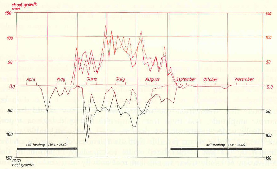 FIG. 10. Course of 3-day length growth of roots and shoots of Robinia pseudoacacia L. (3 years old) with additional soil heating ( ____ ) and of control plants grown under the same conditions but without soil heating (- - -) (root laboratory, Eberswalde, 1963) (data from Hoffmann, 1966b).